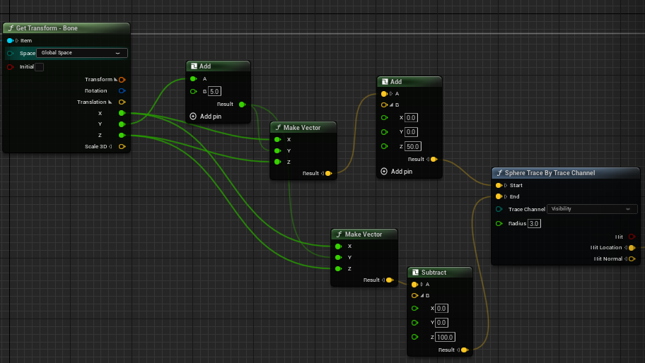 만든 함수의 인자로 Type과 원하는 Bone Name을 넣고 Sphere Trace에 Hit 된 위치 Vector의 Z값을 캐시한다
