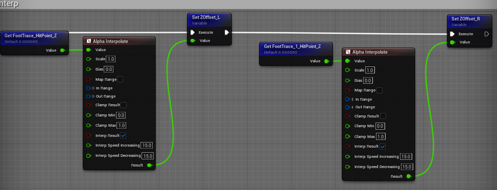 Left Foot, Right Foot에서 발사한 Sphere Trace중 더 낮은 지면에 부딪힌 float값을 Pelvis Offset 변수에 Set해준다 (이만큼 Pelvis를 움직여야 함)