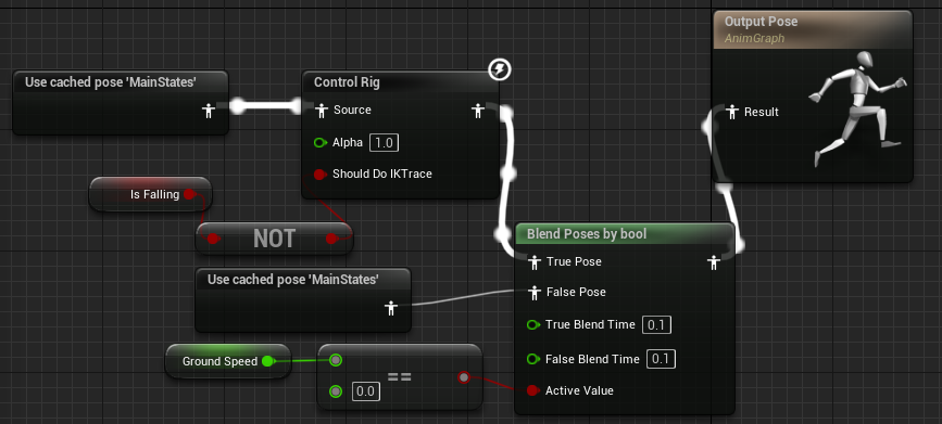 Control Rig Node 시작점에 넣은 bool변수는 점프중이 아니고 서있을때만 FullBody IK를 계산하도록 하기 위해서 만들어 놓은 것이다 따라서 Is Falling Not을 연결해준다