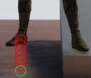 이 Transform을 가지고 아래 방향으로 Sphere Trace를 발사해야 한다 이때 발과 부딪히지 않도록 Y축으로 조금 이동시킨 위치에서 발사하는게 좋다
