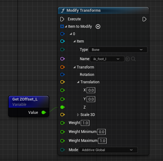 실질적으로 움직여야 할 L,R Foot Z값만큼 Translation.Z에 넣어준다 단 이때 Pelvis는 Pelvis Z값 (Foot L, R Offset중 더 작은 값) 만큼 실제 Pelvis Bone을 제어해주어야 한다