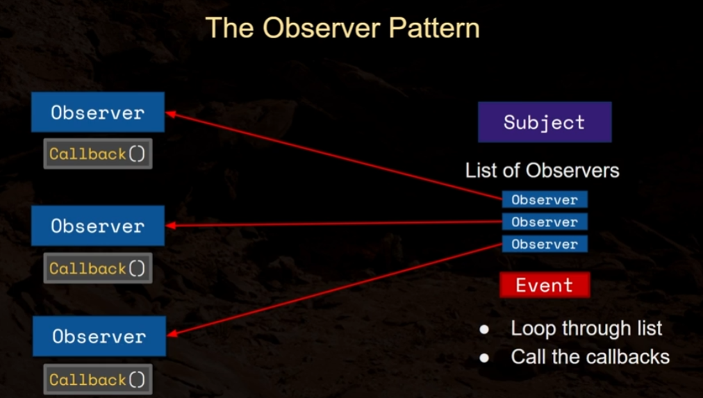 결국에 Subject는 Event가 언제 발생하는지 알고 해당 Event때 Subject가 갖고 있는 특정 Observer의 CallBack()함수를 호출한다